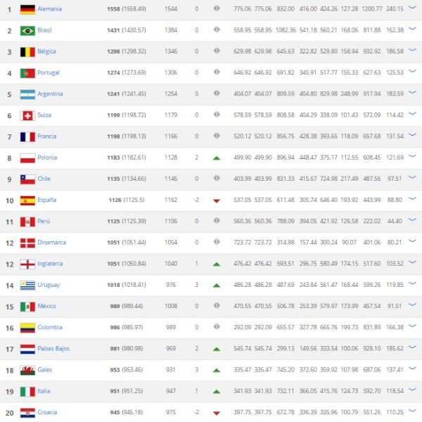 Alemania continúa liderando la clasificación mundial, escoltada por Brasil y Bélgica. Más atrás se ubican Portugal,Argentina, Suiza, Francia, Polonia, Chile y España.
