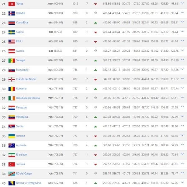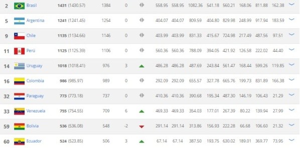 Fuera del Top 10, pero con un ránkingdigno de celebrar, se ubican Perú (11°), Uruguay (14°), México (15°) y Colombia (16°). Rusia, curiosamente, es la selección mundialista peor rankeada (70°).