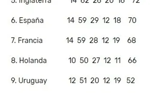 Entre las selecciones latinoamericanas que completan el top 10 se ubican Argentina (4°) y Uruguay (9°), ambas con dos títulos mundiales en sus vitrinas, aunque en el caso del seleccionado argentino con la diferencia de haber disputado otras tres finales.