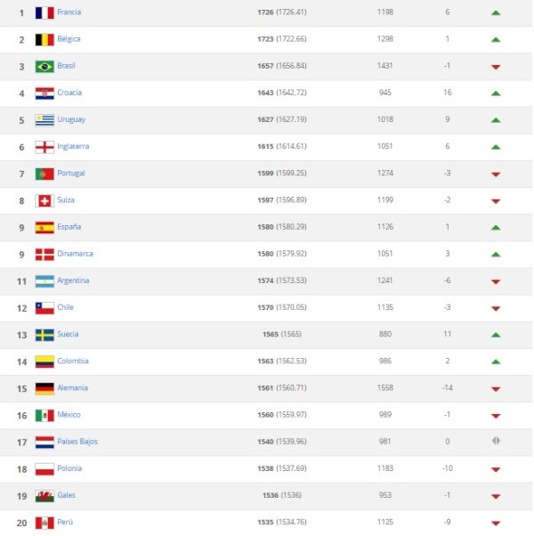 Bélgica, que fue revelación y medalla de bronce, quedó en la segunda posición y Brasil cayó a la tercera colocación. Alemania, que en los últimos cuatro años se había acostumbrado a liderar la clasificación, quedó relegada a la 15° posición tras su eliminación en primera ronda de la Copa del Mundo.