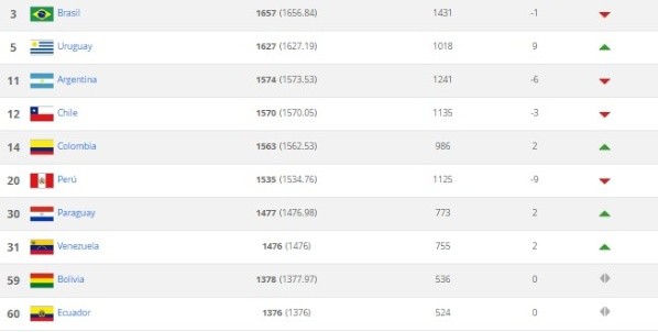Otro seleccionado de marcado descenso fue el argentino, que cayó de la quinta a la undécima posición. Uruguay, en cambio, escaló al quinto lugar por haber alcanzado en Rusia los cuartos de final. También Chile se quedó afuera de las diez primeras posiciones, no pudiendo competir de igual a igual por no haber disputado el último Mundial.