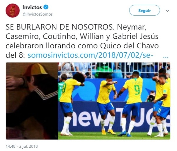 Los mencionados futbolistas de la formación sudamericana festejaron el gol “llorando” de la misma manera que lo hacía “Quico”, personaje del “Chavo del 8”, lo que generó malestar en los mexicanos.