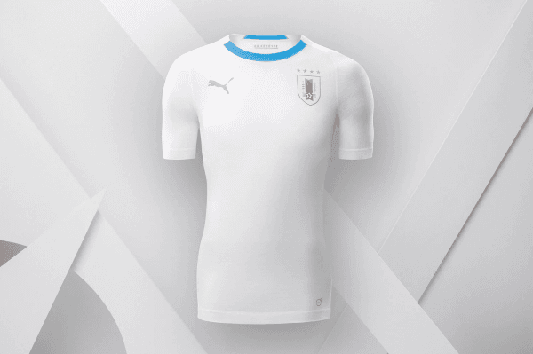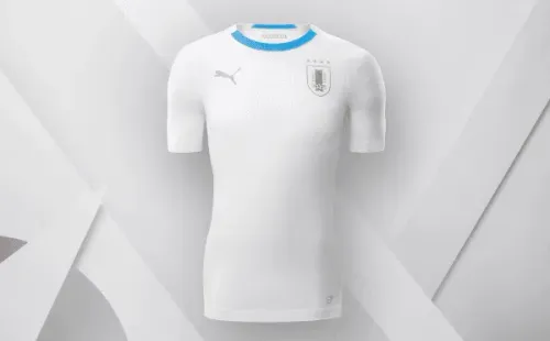 Sin embargo, la camiseta alternativa es mucho más simple: blanco con un detalle en el cuello de color celeste. ¡Esa sí que se ensucia fácil, charrúas!