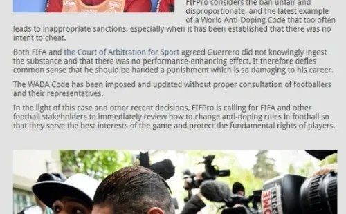 FIFPro considera que la prohibición es injusta y desproporcionada, y el último ejemplo de un Código Mundial Antidopaje que con demasiada frecuencia conduce a sanciones inapropiadas, especialmente cuando se ha establecido que no hubo intención de hacer trampa.