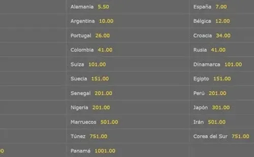 Muy limitados en sus opciones se encuentran los seleccionados de Perú, que paga 201 a 1; Costa Rica, que paga 201 a 1; y Panamá. que al igual que Arabia Saudita paga 1001 a 1.