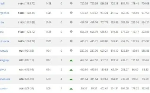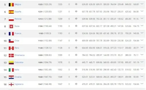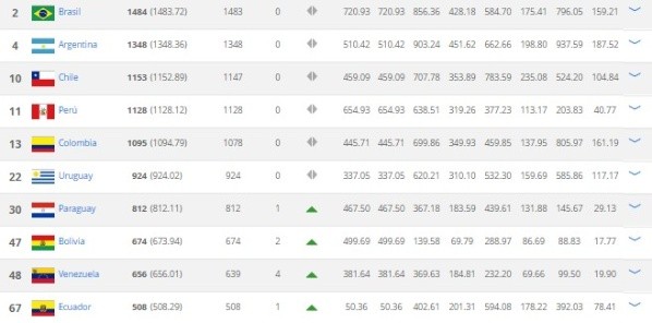 Entre las selecciones latinoamericanas que integran el top 10, siguen destacándose Brasil (2°), Argentina (4°) y Chile (10°), aunque estos últimos no podrán revalidar en Rusia todo su poderío.