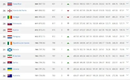 Entre las selecciones que disputarán el próximo mundial, quienes han variado su posición son Islandia (18°), Suecia (19°), Costa Rica (25°), Senegal (27°), Irán (33°), Serbia (34°), Marruecos (42°), Nigeria (52°).
