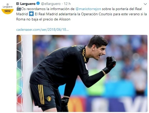 Sin embargo, la falta de acuerdo con Roma acerca del valor de salida de su portero ha provocado que los directivos de Real Madrid se vuelquen hacia un nuevo objetivo, que ayer mismo mantuvo su valla invicta en su debut mundialista: Thibaut Courtois.
