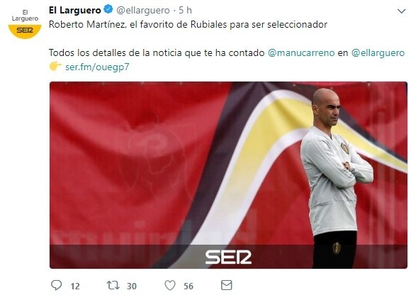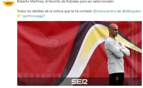 Es que en el programaEl Larguero, deCadena SER, se deslizó que el elegido por el presidente Luis Rubiales es Roberto Martínez, quien actualmente está en plena competencia en el Mundial de Rusia, clasificado con la Selección de Bélgica a cuartos de final.