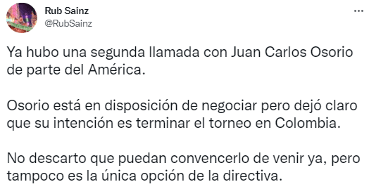 Según cita la misma fuente, la comunicación fue cordial y Osorio se habría mostrado dispuesto a negociar con las Águilas, pero aclarando que su intención es terminar el campeonato colombiano, el cual finaliza en noviembre del 2022. Teniendo en cuenta esto y el desafío personal que implicaría para el cafetero volver a pisar un territorio en el que tuvo problemas, más que la directiva del América no tendría esta única opción, resulta complicado imaginarlo como timonel Azulcrema.