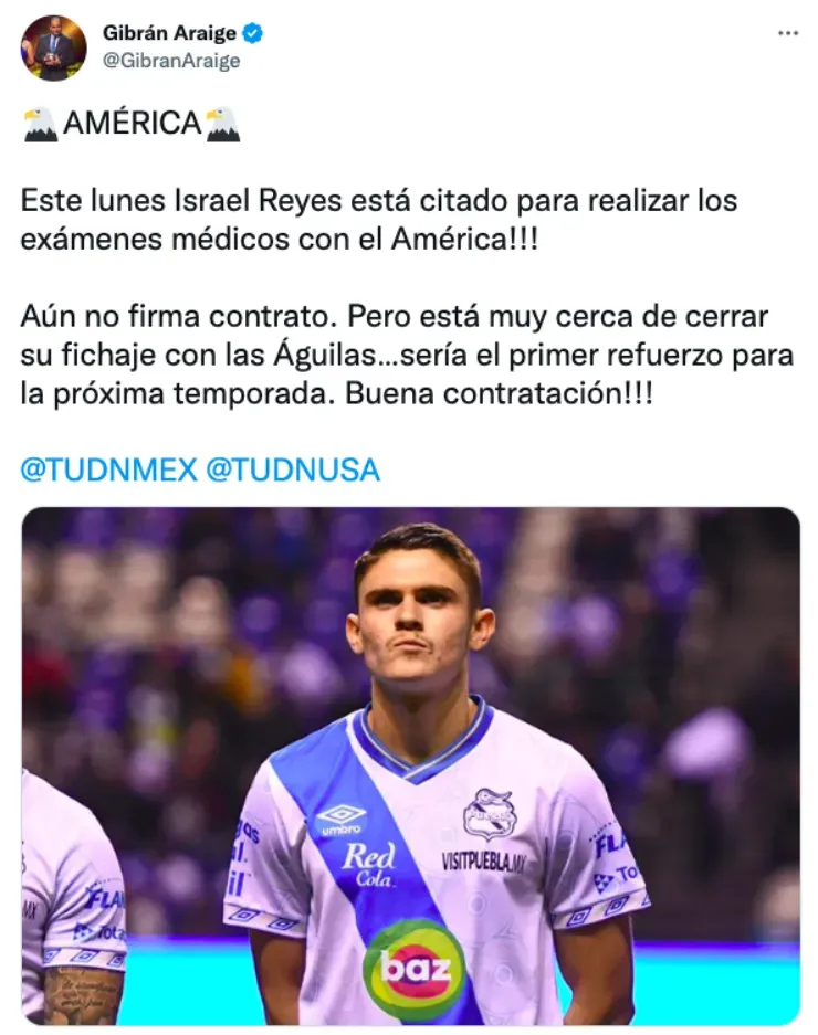Y es que de acuerdo con el periodista Gibrán Araige, los Azulcremas dieron un paso muy importante hacia la contratación de Israel Reyes. El defensa de Puebla es un viejo objetivo del América y ahora estaría citado para someterse a las pruebas médicas con las Águilas.