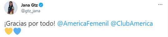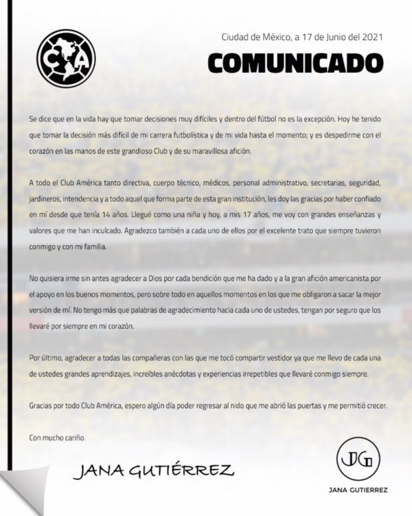 “Se dice que en la vida hay que tomar decisiones muy difíciles y dentro del futbol no es la excepción.Hoy he tenido que tomar la decisión más difícil de mi carrera futbolística y de mi vida hasta el momento; y es despedirme con el corazón en las manos de este grandioso cluby su maravillosa afición”, fueron las palabras de Jana Gutiérrez que dejó de ser jugadora de América, al igual que su hermana Jaidy Gutiérrez.