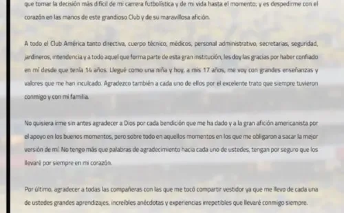 Es así que la despedida de la mediocampista no podíafaltar y el toque nostálgico tampoco,por lo que a través de un comunicado, publicado en su cuenta de Twitter, la juvenil de apenas 17 años de edad expresó su sentir por abandonar el club de sus amores, a tres años de haberse unido a sus filas, en el Clausura 2018.