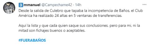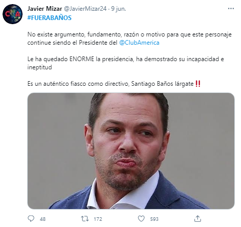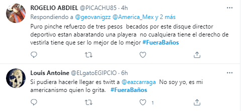 “Mientras Querétaro ya trae a Lucas Podolski , Tigres a otro francés, Santiago Baños no pudo negociar ni a Arturo Vidal ni a Rubens Sambueza. Emilio Azcárraga, patrón,haga un bombazo posible.#FueraBaños“, se puede leer en una de las publicaciones con más interacción de los aficionados del América.