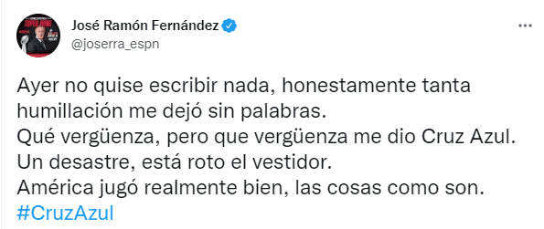“Ayer no quise escribir nada, honestamente tanta humillación me dejó sin palabras. Qué vergüenza, pero que vergüenza me dio Cruz Azul. Un desastre, está roto el vestidor. América jugó realmente bien, las cosas como son”, señaló el comentarista destrozando por completo a La Máquina.