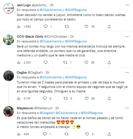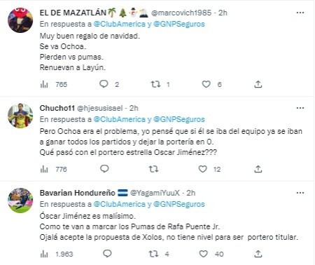 Por otro lado, tras el encuentro los aficionados de las Águilas estallaron en las redes y marcaron a los culpables de haber caído en la noche de hoy. Entre ellos aparecieron Santiago Baños, Óscar Jiménez y Miguel Layún por una afición que exigió cambios y nuevos nombres de cara al próximo campeonato.