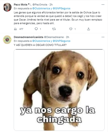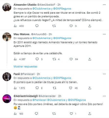 “Siempre lo dije Óscar no está para ser titular en América. Se comió 2 goles en un partido de pretemporada. ¿Los refuerzos cuando llegan? ¿A mitad de temporada?”, expresó uno de los usuarios de Twitter, en el que fue uno de los comentarios que más repitieron entre los fanáticos de América.