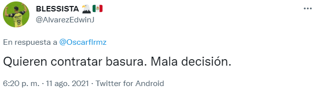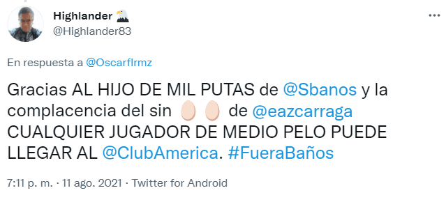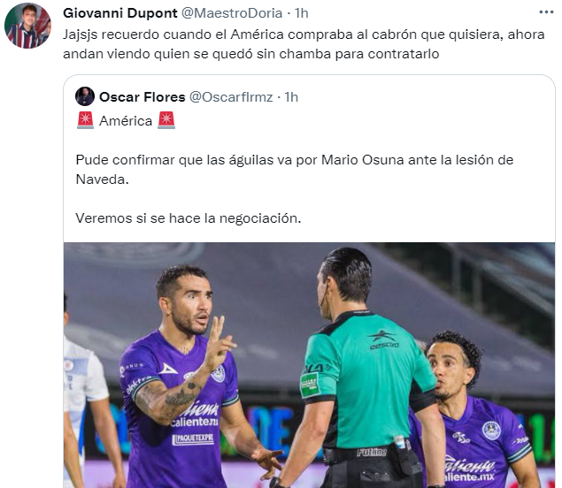 A traves de la red social Twitter, los fanáticos del América se manifestaron en contra de la posible llegada de Mario Osuna a su equipo, ya que, entre otras cosas, consideraron que no se trataría de una incorporación a la altura de la institución. Y no se tardaron los reproches para Santiago Baños y Emilio Azcárraga.