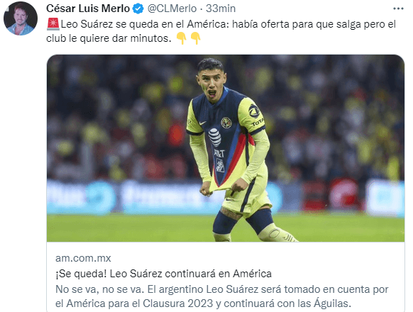 De acuerdo a información de César Luis Merlo para Super Deportivo, América ya le comunicó a Leo Suárez que será tenido en cuenta para el Clausura 2023, por lo que el jugador permanecerá entre sus filas. ¿Logrará esta vez ser importante y conseguir éxitos con las Águilas?