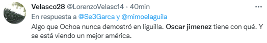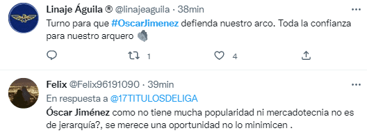 A pesar de la inminente llegada de Luis Malagón, aficionados del América dieron su veredicto respecto de quién debe ser el portero titular. A través de sus redes sociales, muchos usuarios se expresaron a favor de que Óscar Jiménez sea considerado por Fernando Ortíz para el once inicial. Aunque, como siempre ocurre, también hubieron algunos detractores del habitual suplente.