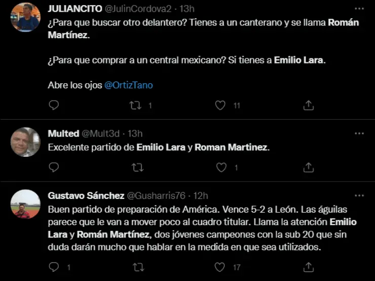 Los aficionados americanistas destacaron en Twitter el trabajo realizado porEmilio Lara y Román Martínez, futbolistas surgidos en las Fuerzas Básicas y que vienen de consagrarse campeones con el Sub-20. Además, ambos se desempeñan en puestos que fueron prioridad a reforzar en este mercado de pases: Lara es defensor central y Martínez, atacante.