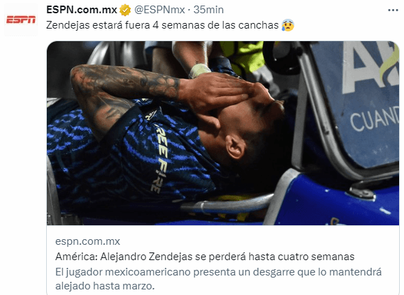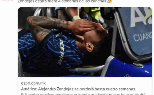De acuerdo a la infromación obtenida por ESPN desde fuentes al interior de Coapa, Alejandro Zendejas estará fuera de las canchas hasta cuatro semanas. En un buen escenario, podría regresar para la Jornada 10 de la Liga MX, cuando los Millonetas reciban al Club Pachuca. Se perdería los juegos ante Necaxa, San Luis, Xolos y Atlas.