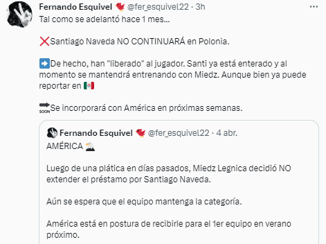 Uno de los asuntos que generaba expectativa en el mundo Americanista era el que involucrabaa Santiago Naveda, quien desde agosto de 2022 fue cedido a préstamo a las filas del Miedź Legnica, equipo de la Primera División de Polonia con el que de momento ha disputado 14 partidos, anotando un gol.
