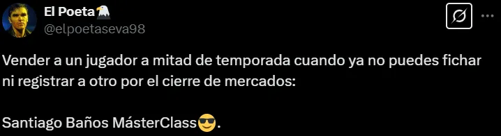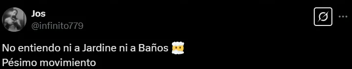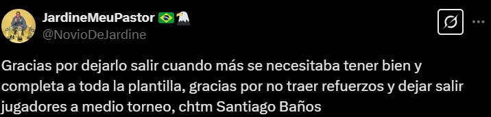 Así, se pudieron leer mensajes apuntados hacia Santiago Baños, presidente deportivo del América, e incluso contra André Jardine, DT artífice del tricampeonato. “La inteligencia deportiva está de adorno”, “una vez más dejando ir a un jugador a medio torneo”, “gracias por dejarlo salir cuando se necesita tener bien y completa a toda la plantilla” y “pésima gestión”, fueron algunos de los recados de los aficionados azulcremas.