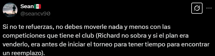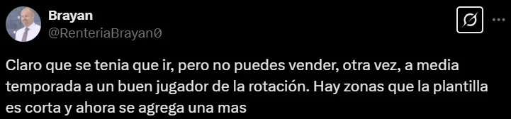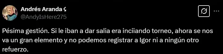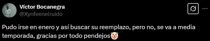 Sin embargo, esta emotividad no pareció tener correlación en las opiniones de muchos fanáticos, quienes lanzaron duras críticas con la directiva por permitir la salida de un futbolista cuando ya no hay posibilidad de reemplazarlo. Al respecto, vale destacar que el plazo para incorporar jugadores cerró el pasado 2 de febrero, aunque permaneció una chance abierta para incorporar hasta el 7 de marzo, aunque en ese caso había un cupo máximo de dos refuerzos solo justificada para reemplazar a un futbolista por lesión o para sumar a aquellos que se encontraran como agentes libres.