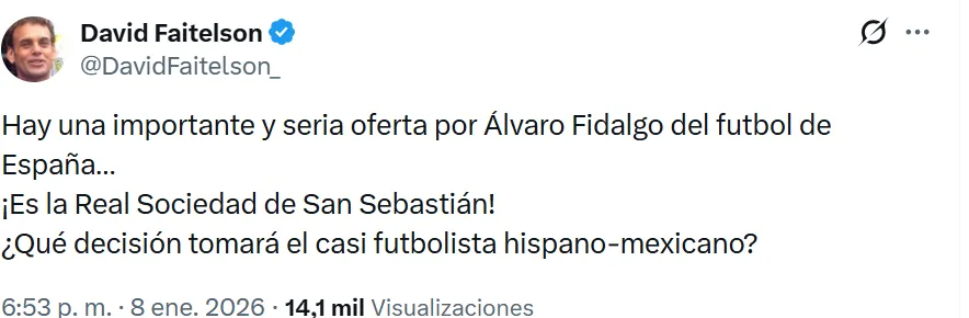 - David Faitelson informó que la Real Sociedad realizó una oferta por Álvaro Fidalgo.
