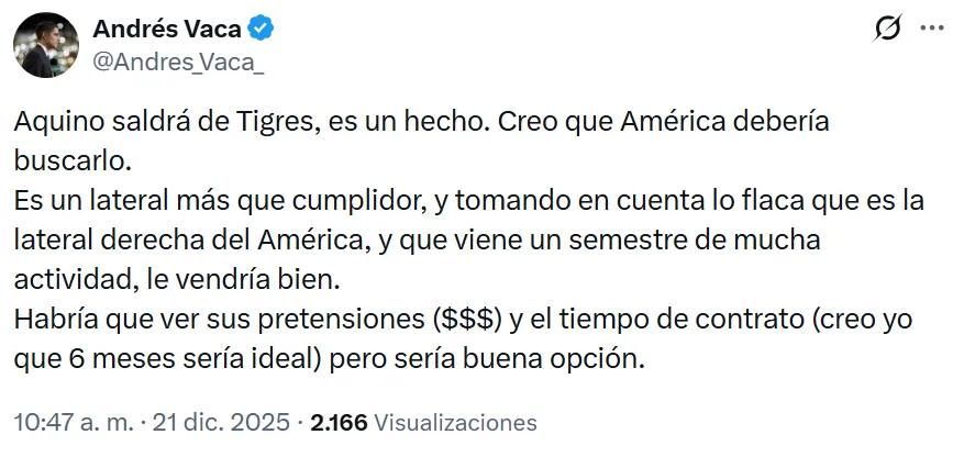 “Aquino saldrá de Tigres, es un hecho. Creo que América debería buscarlo. Es un lateral más que cumplidor y, tomando en cuenta lo flaca que es la lateral derecha del América y que viene un semestre de mucha actividad, le vendría bien. Habría que ver sus pretensiones económicas y el tiempo de contrato; creo que seis meses sería ideal, pero sería una buena opción”, expresó Vaca.