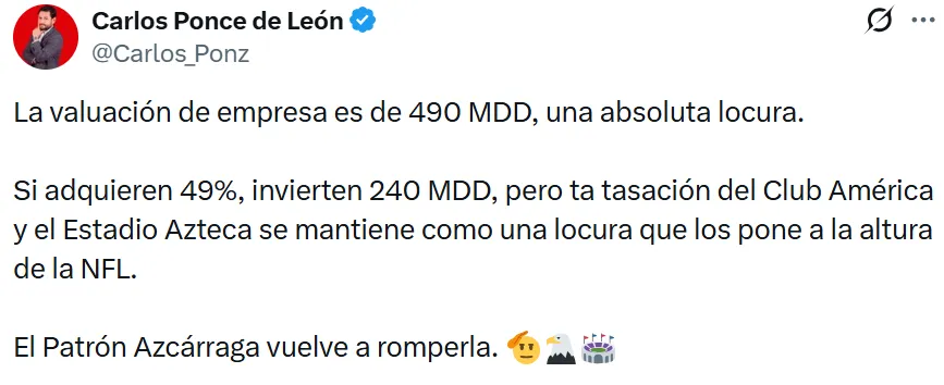 El impacto de la operación se entiende a partir de las cifras que comenzaron a trascender. Carlos Ponce, periodista de Récord, explicó que la alianza se cerró sobre una valuación de empresa cercana a los 490 millones de dólares, una cifra sin precedentes para el futbol mexicano. Bajo ese esquema, la inversión correspondiente al 49 por ciento rondaría los 240 millones de dólares.