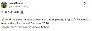 Pero la buena noticia la dio el periodista Jesús Romero, de Posta Deportes, quien mencionó que ahora sí el América podrá hacerse de los servicios de Agustín Palavecino. En el torneo anterior se cuestionó su llegada por la situación de Álvaro Fidalgo, pero ahora que su molestia en la rodilla ha estado latente, es una opción para que pueda unirse a la plantilla.