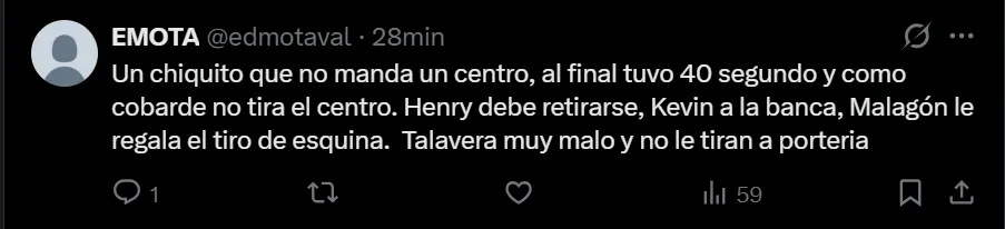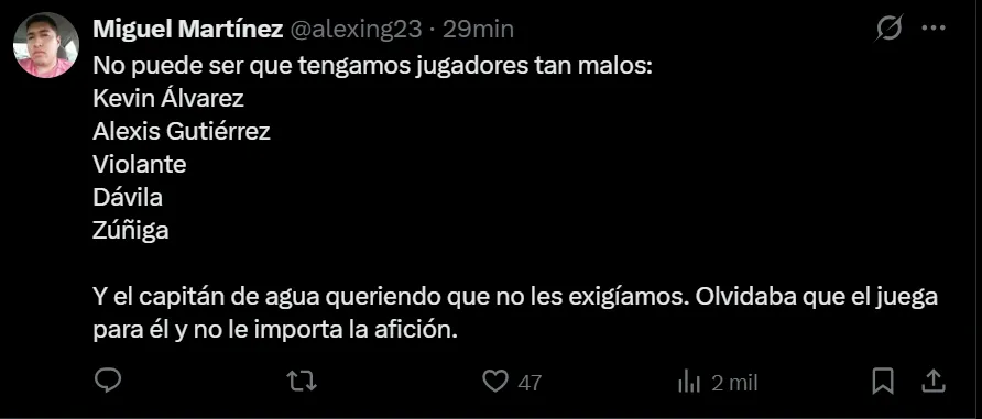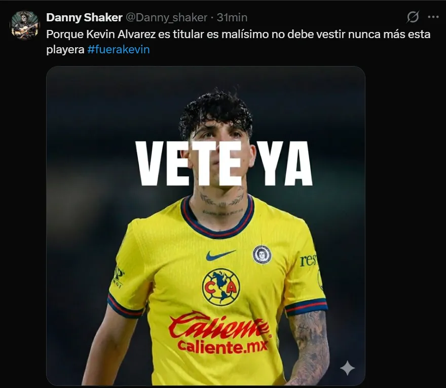 André Jardine, entrenador del equipo y estratega de las Águilas, también fue duramente criticado, pero Álvarez fue el jugador que peor fue tratado en redes sociales. Entre otros comentarios, la gran mayoría pide la salida de Kevin del equipo de manera contundente y reiterada.