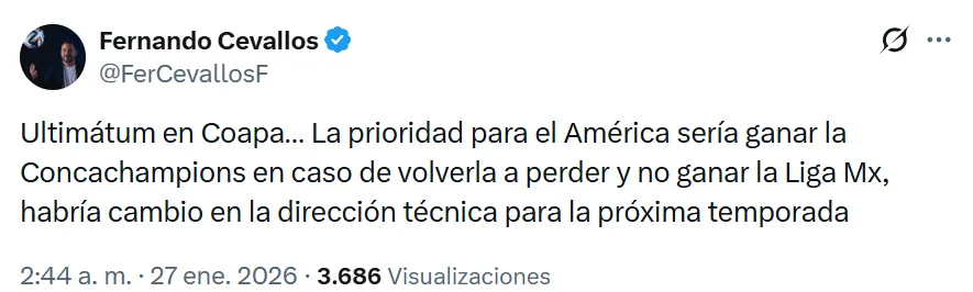 ”Ultimátum en Coapa… La prioridad para el América sería ganar la Concachampions en caso de volverla a perder y no ganar la Liga Mx, habría cambio en la dirección técnica para la próxima temporada”, reveló el periodista de Fox Sports.