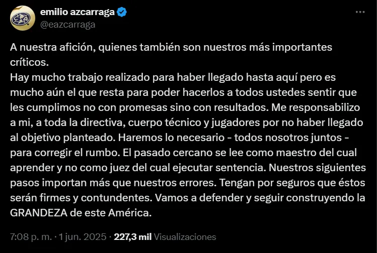 Lejos de poner excusas o mandar un mensaje que podría llegar a molestarle a los aficionados, Emilio Azcárraga rompió el silencio en sus redes sociales e hizo una fuerte autrocrítica tras los golpazos que sufrió el equipo