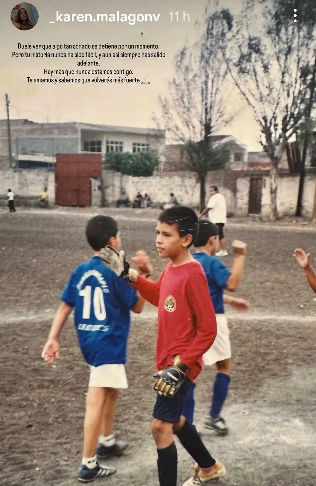 “Duele ver que algo tan soñado se detiene por un momento. Pero tu historia nunca ha sido fácil, y aún así siempre has salido adelante. Hoy más que nunca estamos contigo. Te amamos y sabemos que volverás más fuerte”, fue lo que Karen Malagón compartió en la fotografía en la que se ve el portero en su infancia soñando con un Mundial.