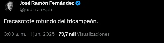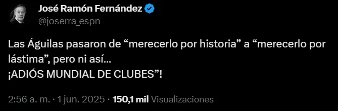 “¡Adiós Mundial de Clubes! Las Águilas pasaron de merecerlo por historia, a merecerlo por lástima… y ni así”, agregó. “No hay tetracampeonato. No hay Mundial. No hay excusas. Solo queda el fracaso”, siguió.