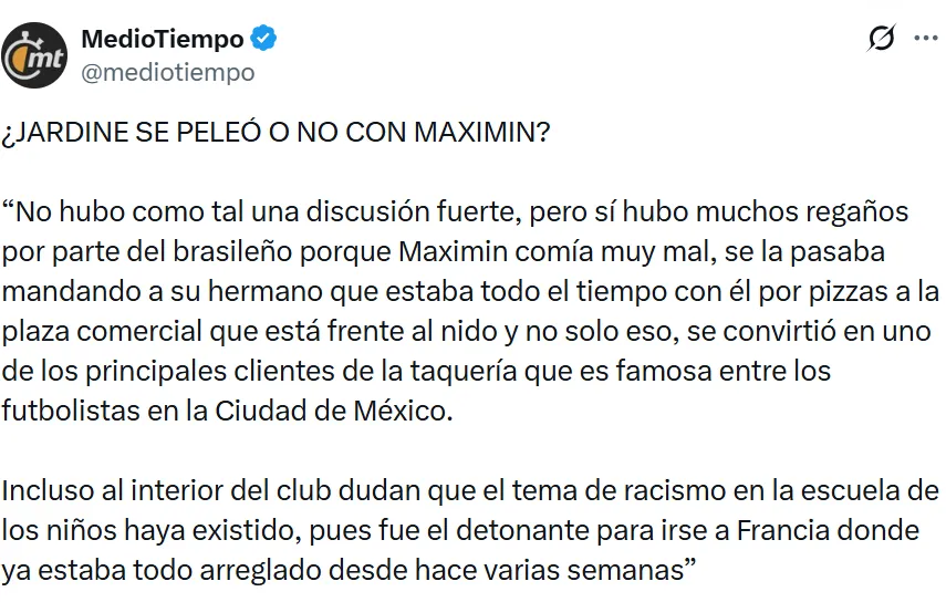 “No hubo como tal una discusión fuerte, pero sí hubo muchos regaños por parte del brasileño porque Maximin comía muy mal, se la pasaba mandando a su hermano que estaba todo el tiempo con él por pizzas a la plaza comercial que está frente al nido y no solo eso, se convirtió en uno de los principales clientes de la taquería que es famosa entre los futbolistas en la Ciudad de México”, explicó el periodista, dejando en evidencia el enojo de Jardine por los hábitos del jugador.