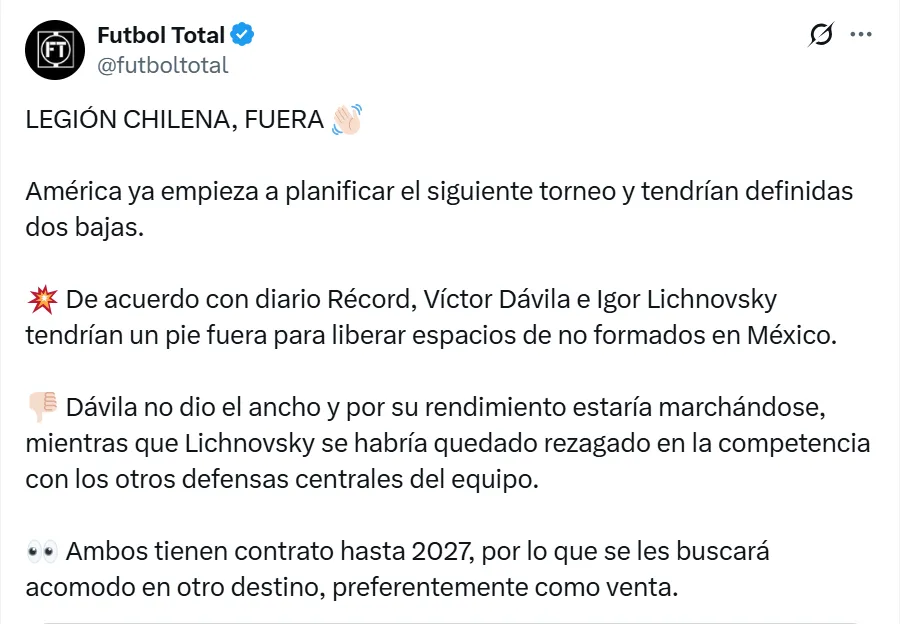 ”Ahora sí, lo del Ave. Pues este torneo, como no había pasado antes, con tantas bajas por lesión, se notó que hay extranjeros que no pesan o les pesa ser titulares, así que en el análisis de los refuerzos ya están apuntadas en la lista los primeros dos para hacer hueco a fichajes internacionales, dos compatriotas curiosamente: Igor Lichnovsky y Víctor Dávila, dos por los que apostaron, pero no dieron el ancho”, reveló Francotirador en Récord.