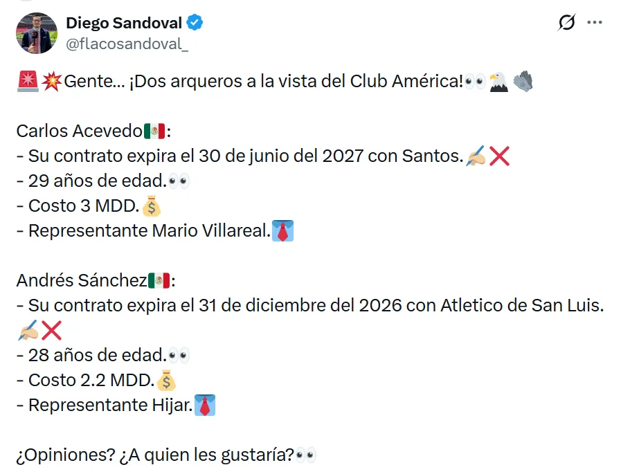 De acuerdo a lo informado por el periodista Diego “Flaco” Sandoval, los dos nombres que aparecen en carpeta son Carlos Acevedo, actual arquero de Santos Laguna, y Andrés Sánchez, de Atlético San Luis. Ambos gustan por su presente y proyección.