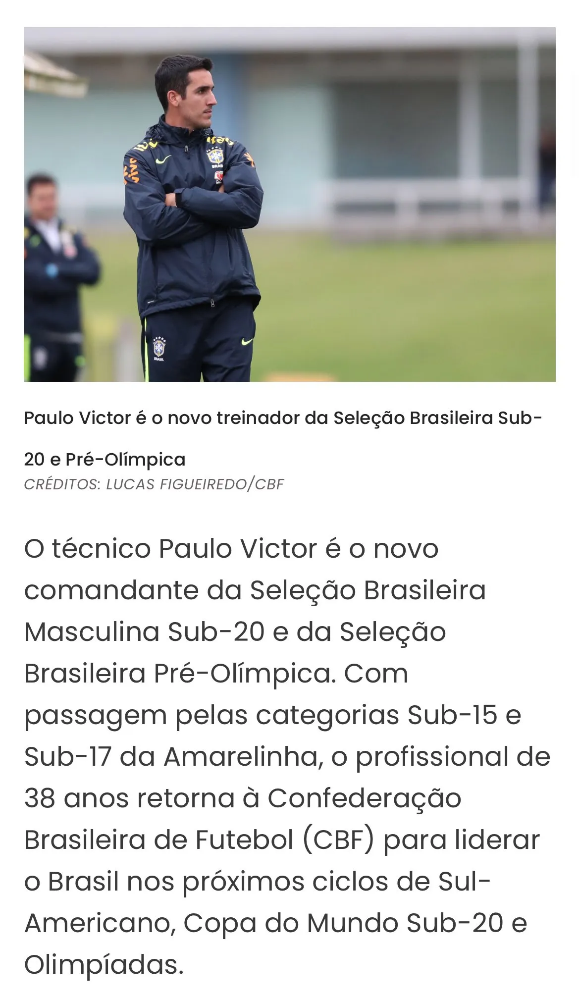 “El técnico Paulo Victor es el nuevo seleccionador de la selección brasileña masculina sub-20 y de la selección brasileña preolímpica. Tras pasar por las categorías sub-15 y sub-17 de la Amarelinha, el profesional de 38 años regresa a la Confederación Brasileña de Fútbol (CBF) para liderar a Brasil en los próximos ciclos del Sudamericano, la Copa Mundial Sub-20 y los Juegos Olímpicos”, informó la Federación de Futbol de Brasil.