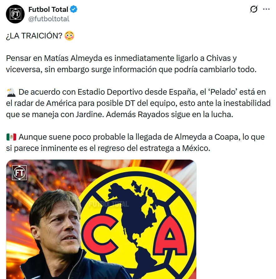 Los regios ya habían buscado contratarlo antes de que Almeyda se fuera a Sevilla, y ahora que necesitan un nuevo director técnico, podrían volver a intentar su incorporación. En cambio, su llegada a Las Águilas parece imposible debido a su pasado con Chivas, que lo hace poco probable en el club capitalino.