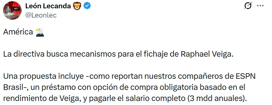 El apuntado es Raphael Veiga, jugador del Palmeiras que ya ha mostrado interés en llegar a México. Según León Lecanda, la directiva busca la manera de concretar su fichaje cuanto antes. Se barajan diferentes opciones para su llegada y el club está dispuesto a hacer un esfuerzo importante. Veiga sería un refuerzo de jerarquía para darle mayor peso al mediocampo de América.