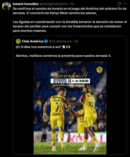 Hace unos días se dio a conocer que la J4 de la Liga MX tendría un imprevisto y es que el mismo día en el que el Club América recibiera en el Estadio Ciudad de los Deportes al Necaxa se llevaría a cabo el concierto de Kanye West en la Plaza de Toros en el mismo horario, pero como no se permiten dos eventos masivos en la alcaldía decidieron cambiar el horario.