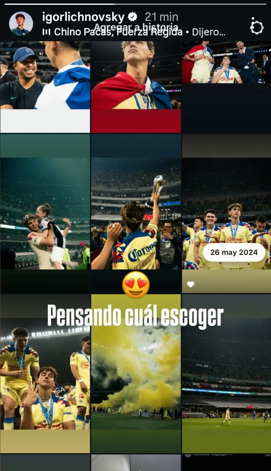 En su cuenta de Instagram, Igor Lichnovsky compartió una serie de imágenes, como parte de un screenshot de sus fotos en su celular y puso la leyenda: “Pensando cuál escoger”. En todas está con el campeonato que obtuvo con las Águilas en mayo del 2024, por lo que de cierta manera ya augura que en poco tiempo se dará su baja.