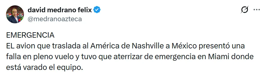 Sin embargo, una noticia de última hora generó un gran susto: el avión que trasladaba al América desde Nashville hacia México presentó una falla en pleno vuelo y tuvo que realizar un aterrizaje de emergencia en Miami, donde el equipo permanece varado. La información fue confirmada por David Medrano, periodista especializado en el club.