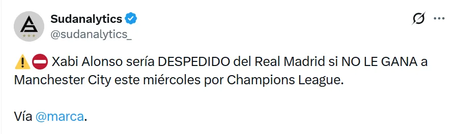 De acuerdo con lo publicado por Diario Marca, la situación es tajante: Xabi Alonso podría perder su cargo si no logra ganar frente a los Citizens. El club considera que este partido es una verdadera prueba de carácter para un proyecto que todavía no consigue despegar.