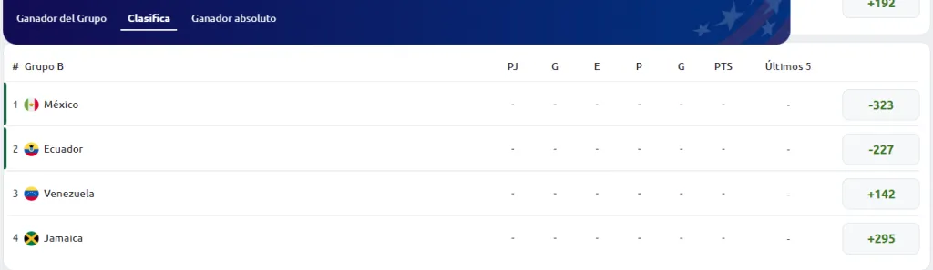 Ahora vamos a centrarnos en un mercado más generalista de las apuestas de México en la Copa América: el grupo ganador. Si apuestas por el Grupo B, donde está encuadrado México, es como si apostases a que la Copa América la ganará México, Ecuador, Jamaica o Venezuela. Los momios campeón Grupo B en torno a +500 tienen poco o ningún valor.