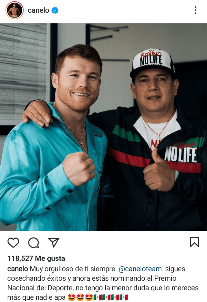 A través de su cuenta de Instagram, el boxeador tapatío dio cuenta de la nominación y llenó de elogios a su entrenador: “Muy orgulloso de ti, siempre @caneloteam, sigues cosechando éxitos y ahora estás nominando al Premio Nacional del Deporte, no tengo la menor duda que lo mereces más que nadie apa”, fueron las palabras del pugilista.